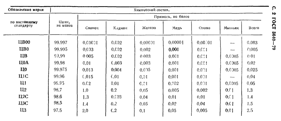 Цинк марки Ц2 — это металл, в котором цинк содержится не менее 98,7%, согласно таблице химического состава ГОСТ 3640-79. Добавление свинца, олова и других элементов также должно соответствовать требованиям ГОСТ 3640-94.